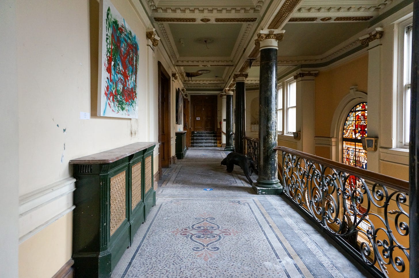 The exhibition is divided across the sprawling 52,000 square feet and takes viewers on a journey through some amazing rooms including a beautiful grand ballroom, a courtroom in the round with original stained-glass windows and tiered seating, cells complete with the original bars from their time as holding chambers and basement vaults. Many of the works have been produced in isolation during lockdown and are exhibited for the first time. Artists were given free reign, not just for their art to occupy a room and to be on the walls but for them to be on the walls. And ceilings, and the floors, and the staircases. It felt like being in an artistic squat.