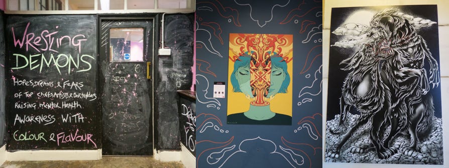 Taking over the old medical wing of the town hall ‘Wrestling Demons’ is a collaborative project from 60 top artists overseen by Alex Fatho-Bland, exploring our relationship and attitudes towards mental health. The paintings and sculptures are all inspired by conversations between the artists involved and those who work in the hospitality industry. The different experiences and mediums create an eye catching and thought provoking walkthrough of how we see and treat mental health.