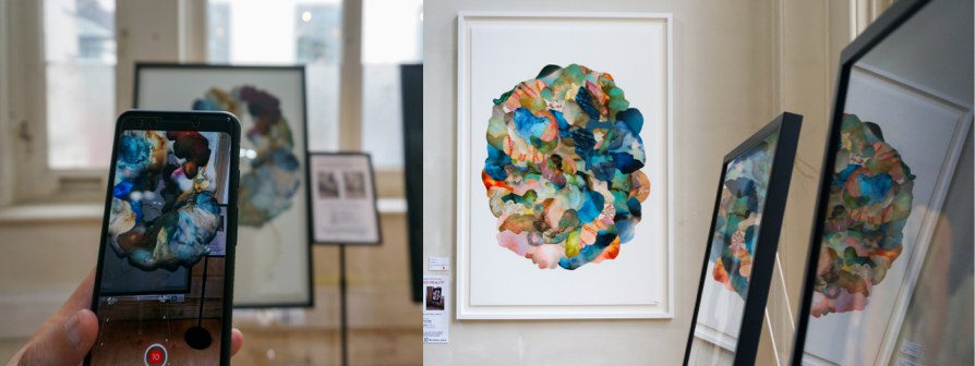 The first artist was Ariadne Dane with their AR work, the only artist that encouraged the use of an additional app, Artivive App, to deliver the new layers of visual interest and meaning to physical artwork. It was the first time that we had seen AR incorporated into an art exhibition like this. Coupled with the additional soundscape for each piece, which can be heard through the app, placed Dane’s work firmly on this list.